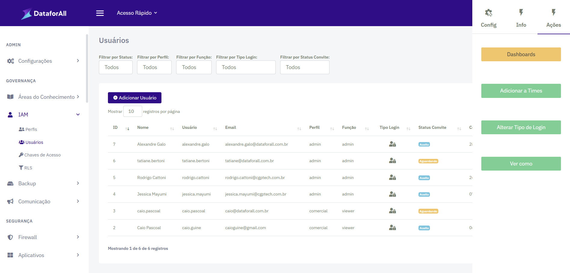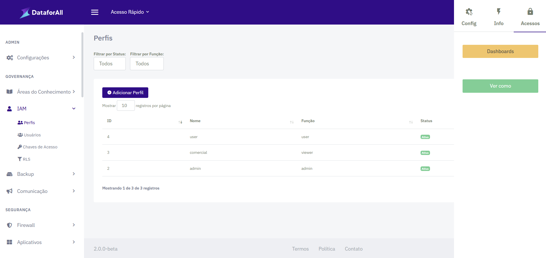 A funcionalidade Ver Como permite que administradores da Dataforall Platform visualizem a plataforma exatamente como um usuário do tipo viewer a veria. Com isso, é possível validar permissões, verificar acessos liberados e garantir a governança dos perfis e usuários.